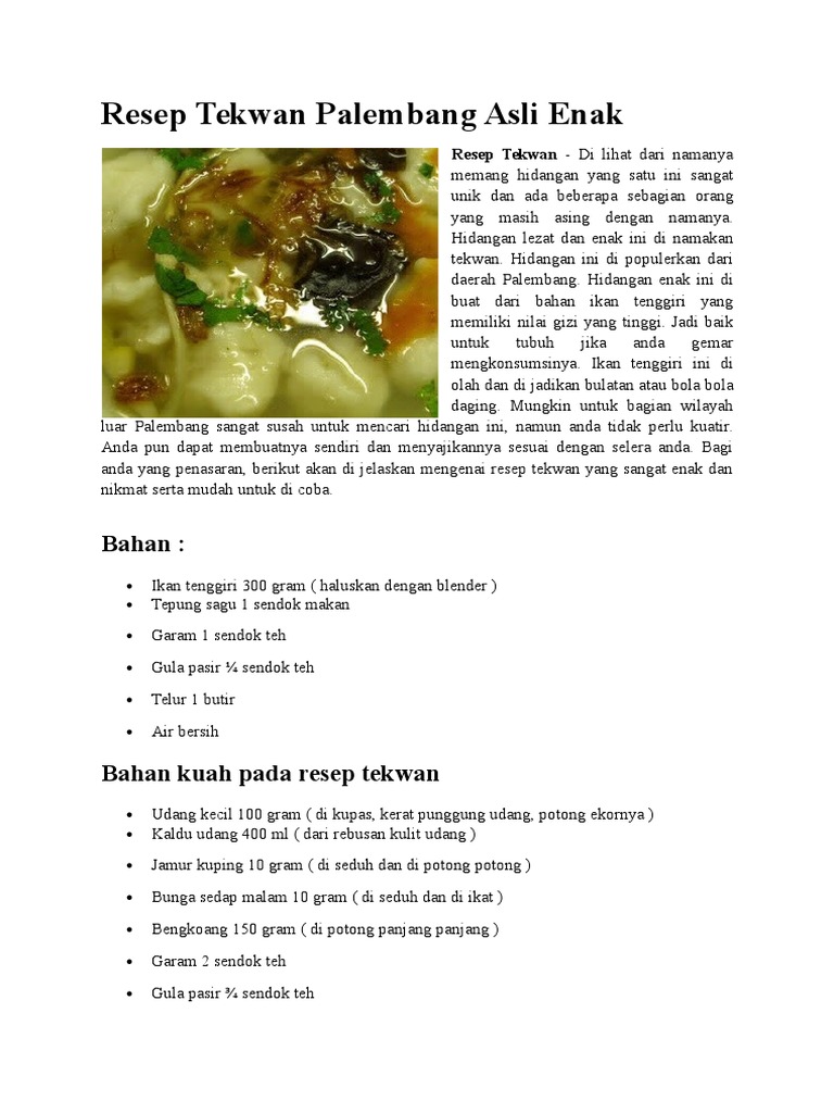Rupa dan tekstur dari tekwan ikan tengiri khas kuah tekwan : Resep tekwan yang mudah dibuat seperti di atas bisa menghasilkan sekitar 10 porsi atau lebih, dengan durasi pembuatan kurang. Resep tekwan ncc enak khas palembang mp3 & mp4. Teman teman mungkin beranggapan bahwa cara membuat tekwan ini sulit, tetapi sebenarnya cukup mudah lho. Sebab tekwan adalah hidangan sup yang disajikan bersama dengan jamur kuping, bihun, serta bengkuang.